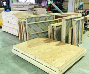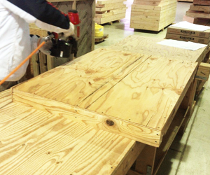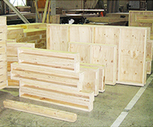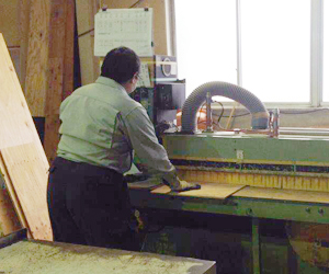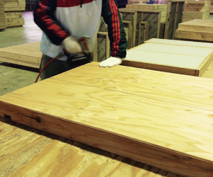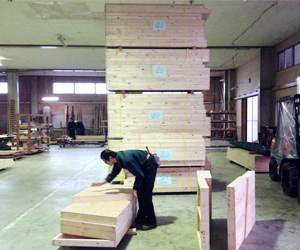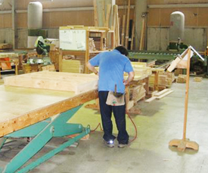 パネルになる枠材と面材・断熱材のカット作業